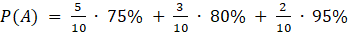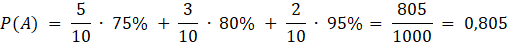 W tym zadaniu musisz obliczyć prawdopodobieństwo zdarzenia, że wybrano podzespół pierwszego gatunku, jeśli trzy fabryki produkują podzespoły, stosunek ilości produkcji to 5:3:2, a ilość produkowanych podzespołów I gatunku to odpowiednio 75%, 80% i 95%.