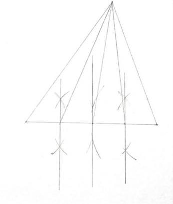 5. Z końców odcinka równego połowie podstawy przy pomocy cyrkla, zakreśl po jednym łuku o promieniu równym długości podstawy tak, by przecięły się w jednym miejscu.