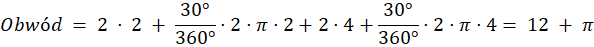 , gdzie α oznacza kąt zakreślony przez dany łuk, natomiast r oznacza promień danego łuku. Obwód danej figury oblicz sumując kolejne długości boków oraz łuków wykorzystując następujący wzór