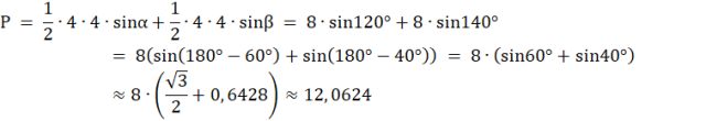 Pole trójkąta jest równe połowie iloczynu długości dwóch boków trójkąta i sinusa kąta między tymi bokami. Pole zacieniowanej figury jest równe sumie pól obu trójkątów równoramiennych utworzonych przez dorysowanie dodatkowego promienia okręgu. Wówczas otrzymujesz dwa kąty w zacieniowanych figurach w wierzchołku S: w lewej α i w prawej β.