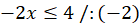 Aby obliczyć nierówność, przenieś wszystkie niewiadome na lewą stronę, a wiadome na prawą stronę. Podczas przenoszenia pamiętaj zmienić znak. Pozbądź się liczby przy x poprzez podzielenie równania przez liczbę znajdującą się przy x. Kiedy w nierówności dzielisz lub mnożysz całą nierówność przez liczbę ujemną, to znak nierówności obróć w drugą stronę. Przedział liczb, które spełniają nierówność to liczby większe lub równe -2 i mniejsze lub równe 2.