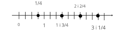 Na narysowanej osi oznacz punkt 1 i podziel ten odcinek na cztery części, tak, aby punkty były, co