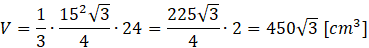Znajdź objętość ostrosłupa prawidłowego trójkątnego, którego krawędź podstawy ma długość 15 cm, a wysokość wynosi 24 cm.