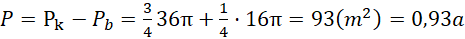 Oblicz pole koła, jakie zakreśla łańcuch. Zauważ, że tylko 3 ćwiartki koła to pole o promieniu 6 m, pozostałe wycinki to ćwiartki kół o promieniach równych różnicy długości łańcucha ściany budynku. Pamiętaj, że 1a=100m2.