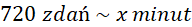 Ułóż proporcję, w której niewiadomą będzie ilość czasu potrzebna dyrektorowi do wypowiedzenia 720 zdań. Następnie oblicz niewiadomą, dzieląc ilość wszystkich możliwych zdań przez ilość zdań wygłaszanych na minutę.