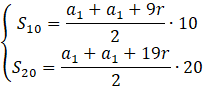 Zapisz S10 i S20 jako sumy a1 i r, a następnie rozwiąż tak powstały układ równań, wyznacz trzydziesty wyraz ciągu i oblicz sumę.