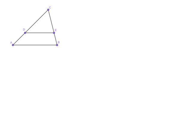 Prosta jest równoległa do podstawy, oznacza to, że kąty |∢CDE| oraz |∢CAB| są takie same. Zauważ, że trójkąty mają dwa takie same kąty, a więc są do siebie podobne z cechy KK. Następnie oblicz skalę podobieństwa (k). Wykorzystując skalę oblicz długość CE oraz BE. Utwórz proporcję z obliczonych boków i rozwiąż ją.