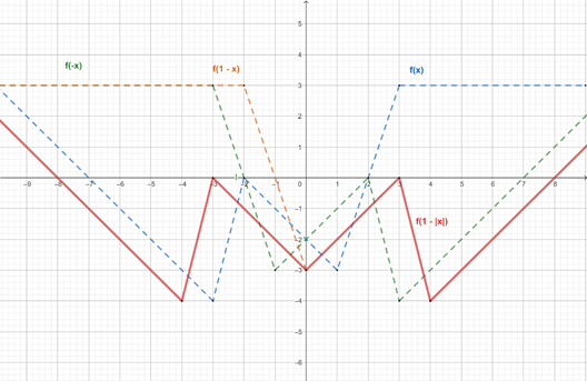 – zamień wykres stronami (lewa, prawa). Teraz przesuń wykres o jedną jednostkę w prawo. Ostatnim krokiem będzie symetryczne odwzorowanie prawej strony wykresu na lewą i otrzymanie funkcji: