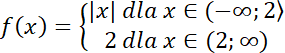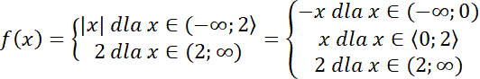 zapisz bez użycia symbolu wartości bezwzględnej, zauważ, że jeśli jest to liczba dodatnia, to jej wartość bezwzględna jest tą liczbą, a jeśli jest to liczba ujemna, to jej wartością bezwzględną jest liczba przeciwna. Wybierz krańcowe argumenty, które będą należały do przedziałów każdej z dwóch funkcji i wyznacz ich wartości dla wzoru funkcji