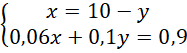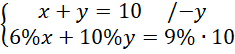 Oblicz, ile gramów jednego roztworu i ile drugiego powinien zmieszać, jeśli laborant potrzebuje 10 g roztworu azotanu potasu o stężeniu 9%, a ma do dyspozycji roztwory tego związku o stężeniach 6% i 10%.