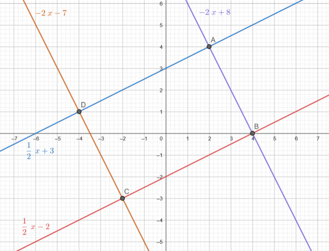 Narysuj proste podane w treści zadania w układzie współrzędnych i zaznacz punkty ich przecięcia, czyli wierzchołki równoległoboku.
