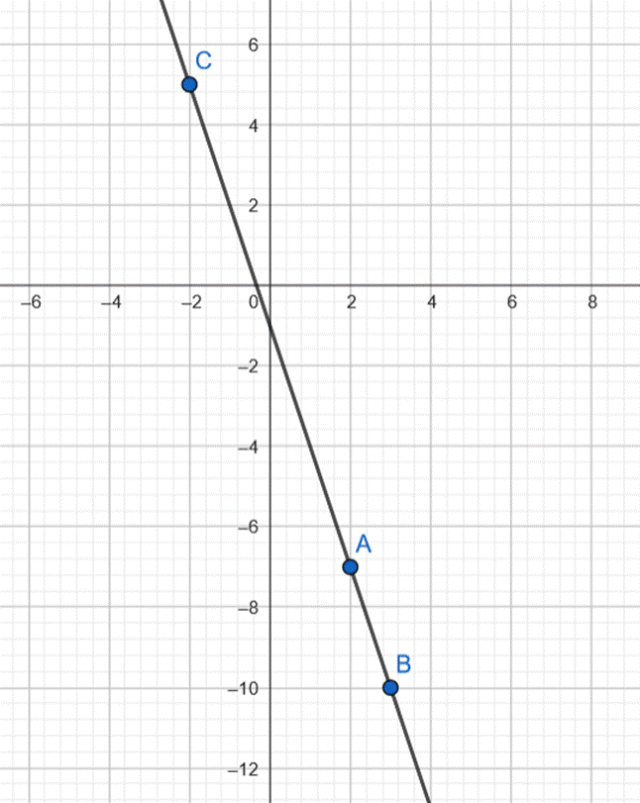 Ustal, czy punkty A(2,-7), B(3,-10), C(-2,5) należą do wykresu tej samej funkcji liniowej.