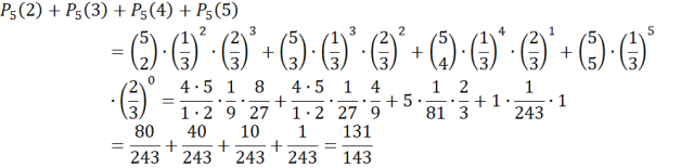 Wyznacz prawdopodobieństwo tego, że co najmniej dwa razy wypadnie liczba oczek większa od 4 podczas pięciokrotnego rzutu kostką.