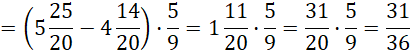 Możesz zamienić liczbę dziesiętną na liczbę mieszaną lub zapisać wszystkie wartości w postaci dziesiętnej i zamienić je na ułamki zwykłe przed wykonaniem dzielenia (iloraz będzie miał rozwinięcie dziesiętne nieskończone). Pamiętaj, by najpierw wykonać działania w nawiasie, tam także obowiązuje kolejność wykonywania działań: najpierw mnożenie, a po nim odejmowanie. Wykonując mnożenie, zapisz liczby mieszane jako ułamki niewłaściwe, a następnie sprowadź wynik i odjemną do wspólnego mianownika (by uniknąć dużych liczb, wyłącz całości w iloczynie). Na koniec zastąp dzielenie mnożeniem przez odwrotność dzielnika (przed odwróceniem zapisz go jako ułamek niewłaściwy), skracaj czynniki, gdy to możliwe.