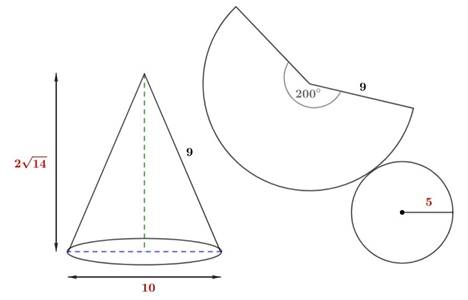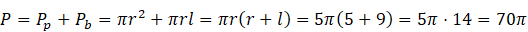 , gdzie l – tworząca stożka, którą oblicz, stosując twierdzenie Pitagorasa. Promień podstawy stożka (r) wyznacz za pomocą długości wycinka koła.