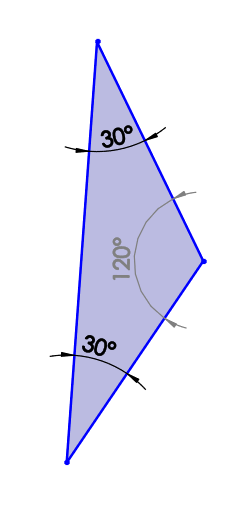 W trójkącie równoramiennym kąty przy podstawie mają tę samą wartość. W tym przykładzie jest to 30°. Suma kątów w trójkącie to 180°.