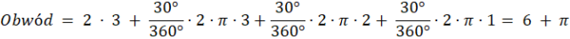 , gdzie α oznacza kąt zakreślony przez dany łuk, natomiast r oznacza promień danego łuku. Obwód danej figury oblicz sumując kolejne długości boków oraz łuków wykorzystując następujący wzór