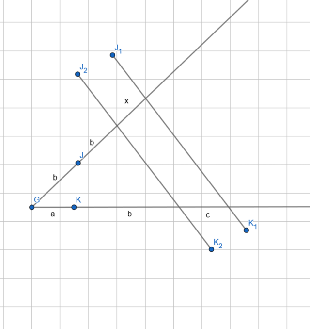 Skonstruuj Talesa (jeżeli kąt zostanie przecięty prostymi równoległymi to stosunki odpowiednich odcinków będą równe) do budowy odcinka