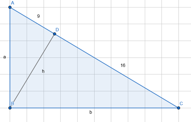 Wylicz przyprostokątne trójkąta prostokątnego, jeśli wysokość poprowadzona z wierzchołka kąta prostego dzieli przeciwprostokątną na odcinki o długości: 0,9 dm; 1,6 dm.