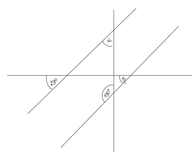 W tym zadaniu oblicz miary kątów oznaczonych greckimi literami. Pamiętaj, że proste oznaczone kolorem niebieskim są równoległe.
