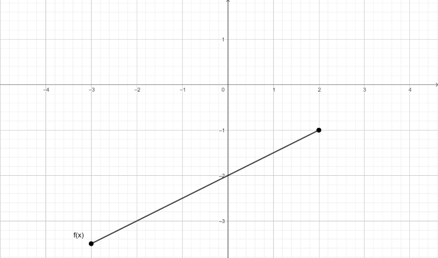 Wykonaj tabelkę, na górze podaj liczbę, którą podstawisz za x, aby wyliczyć y. Dzięki temu wyznaczysz współrzędne punktów, należących do wykresu funkcji. Zaznacz te punkty na wykresie współrzędnych i połącz je ze sobą. Wykres jest ograniczony na przedziale ⟨-3; 2⟩, jako że przedział jest zamknięty, to krawędzie funkcji są zamalowanymi kółkami, ponieważ te punkty należą do wykresu funkcji.
