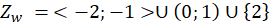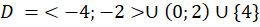 Dziedziną funkcji jest przedział domknięty pomiędzy -4, a -2, przedział otwarty pomiędzy 0, a 2 oraz