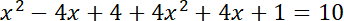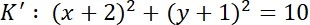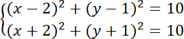 Okrąg K ma środek w punkcie S(2, 1). Okrąg K’ ma środek w punkcie S’(-2, -1) – symetrycznie względem środka układu współrzędnych. Przyrównaj do siebie równania obu okręgów i znajdź ich punkty wspólne.