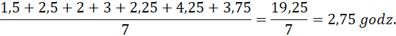 Musisz obliczyć średnią arytmetyczną liczby godzin, przez jakie pani Ewelina trenuje każdego dnia. Średnia arytmetyczna to suma liczb podzielona przez ich liczbę.