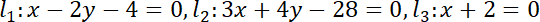 Znajdź współrzędne wierzchołków trójkąta, którego boki są zawarte w prostych: