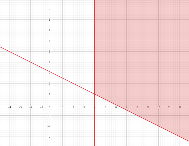 Przedstaw na płaszczyźnie zbiór punktów, które spełniają układ nierówności {x40x+2y6. Zbadaj, czy odcinek łączący punkty A(18,5)oraz B(24,2)ma punkt wspólny z brzegiem tego zbioru.