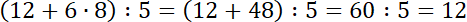 Pamiętaj, najpierw wykonujemy działanie w nawiasie, a w nim pierwszeństwo ma mnożenie. Następnie wykonaj dodawanie w nawiasie, a wynik podziel przez 5.