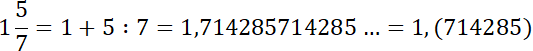 Zwróć uwagę, liczbę w mianowniku nie można rozłożyć na czynniki pierwsze składające się z 2 i 5, więc ułamek jest nieskończony. Podziel pisemnie jego licznik przez mianownik. Powtarzającą się grupę cyfr zapisz w okresie.