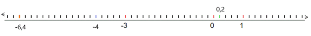 Pamiętaj, iloczyn liczb o różnych znakach jest liczbą ujemną. Przesuń przecinki i wykonaj dzielenie. Następnie przyjrzyj się osi liczbowej: każda większa kreska oznacza jedną całość, a każda mniejsza kreska –0,2. Odszukaj na lewo od zera i zaznacz liczbę (–6,4).