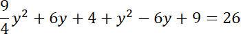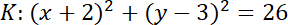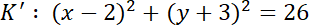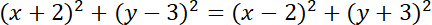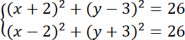 Okrąg K ma środek w punkcie S(-2, 3). Okrąg K’ ma środek w punkcie S’(2, -3) – symetrycznie względem środka układu współrzędnych. Przyrównaj do siebie równania obu okręgów i znajdź ich punkty wspólne.