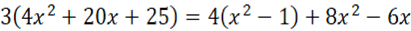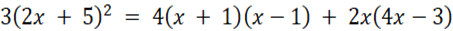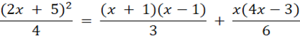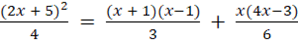 Na początku należy pomnożyć równanie przez 12, by pozbyć się ułamków, następnie wykorzystać wzory skróconego mnożenia na kwadrat sumy i różnicę kwadratów i pomnożyć otrzymane wyrażenia przez liczbę poprzedzającą nawias. Następnie należy przenieść niewiadome na lewą stronę równania a liczby na prawą stronę równania. Na koniec dzielimy równanie przez liczbę stojącą przy x.