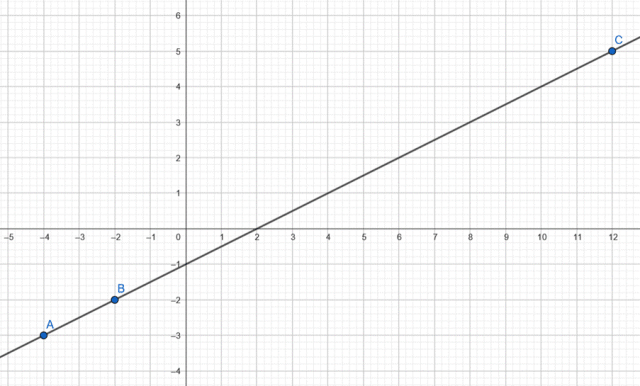 Ustal, czy punkty A(-4,-3), B(-2,-2), C(12,5) należą do wykresu tej samej funkcji liniowej.