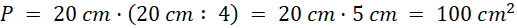 Policz pole prostokąta, w którym: jeden bok ma 20 cm, a drugi jest 4 razy krótszy.