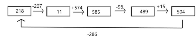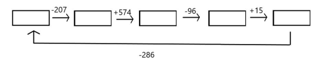 Uzupełnij graf, tak, aby suma liczb na strzałkach wynosiła zero. Graf działa na takiej zasadzie, że niezależnie od wartości jaka zostanie wpisana w pierwsze okienko po przejściu całego grafu po strzałkach wrócimy do tej samej wartości. Łączna wartość liczb wpisanych na strzałkach musi wynosić 0, żeby po okrążeniu całego grafu wartość w pierwszym okienku się nie zmieniła.