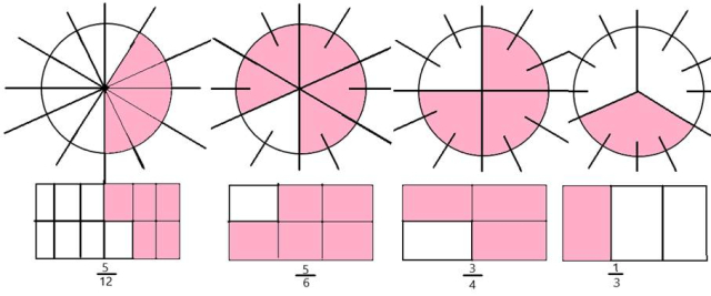 Podziel koło i prostokąt na odpowiednio 12, 6, 4 i 3 części, a następnie zamaluj odpowiednio 5, 5, 3 i 1 z tych części.