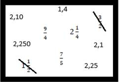 Do pierwszej kolumny wpisz ułamki dziesiętne bez 0 na końcu. W drugiej kolumnie dodaj zero na końcu. W trzeciej kolumnie zmień ułamek na liczbę mieszaną. W czwartej kolumnie zmień liczbę mieszaną na ułamek niewłaściwy.