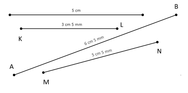 W tym zadaniu podpisz odpowiednio narysowane odcinki, wiedząc, że odcinek AB jest najdłuższy, MN jest o 1 cm krótszy od niego, KL jest o 2 cm krótszy od odcinka MN, albo KL jest o 3 cm krótszy od odcinka AB.