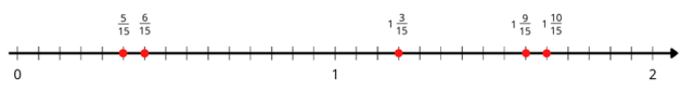 Rozszerz podane liczby do wspólnego mianownika. Narysuj oś o odcinku jednostkowym podzielonym na tyle części ile wynosi liczba wspólnego mianownika tych ułamków.