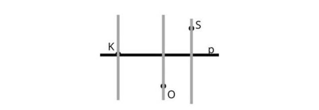 Narysuj prostą p i punkt K, który leży na prostej p. Zaznacz punkty O i S, które nie leżą na prostej p. Poprowadź proste prostopadłe do prostej p, przechodzące przez punkty K, O i S. Odpowiedz, jakie jest położenie narysowanych prostych względem siebie.