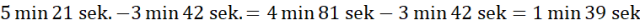 Na początek przyjrzyj się tabelce: zawodnik z najdłuższym czasem dobiegł na metę ostatni, był to Robert. Zwycięzca miał najkrótszy czas, był to Mateusz. Następnie odejmij od czasu Roberta czas zwycięzcy – otrzymasz czas, jaki dzielił tych zawodników. Jeżeli odjemnik ma więcej sekund od odjemnej, zamień jedną minutę czasu Roberta na sekundy.