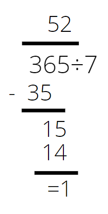 Jak wiesz, rok ma 365 dni. Tydzień ma 7 dni. Podziel ilość dni w roku przez siedem, aby otrzymać liczbę tygodni w roku. W rozwiązaniu pojawiły się 52 tygodnie i jedynka, która oznacza jeden dzień. Oznacza to, że 365 nie dzieli się przez 7 bez reszty.