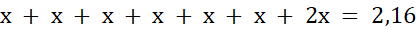 Aby rozwiązać to zadanie, musisz stworzyć równanie. Wiesz, że cały chleb ważył 2,16 kg. Wiesz także, że od poniedziałku do soboty Ewa zjadała taką samą, niewiadomą ilość chleba. Oznaczmy tę niewiadomą jako x. Czyli w poniedziałek zjadła x, we wtorek zjadła x – i tak aż do soboty. Wiesz też, że w niedziele zjadła dwa razy więcej, czyli 2 • x.