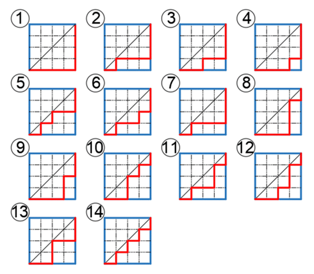 Poruszamy się po siatce kwadratu w prawo lub w górę, jednocześnie nie przechodząc nad przekątną kwadratu. Należy wykazać, że istnieje 14 różnych dróg.