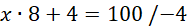 Ułóż równanie na podstawie treści zadania. Ilość piłek nazywamy niewiadomą x, pomnóż ją przez cenę piłki (8 zł) oraz dodaj do tego 4 zł, ponieważ cena piłek i reszta wydana przez kasjera to razem 100 zł. Rozwiąż równanie.