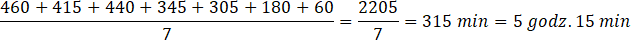 Musisz obliczyć, ile czasu Magdalena średnio uczyła się każdego dnia. Wynik musisz podać w postaci wyrażenia dwumianowego, które zawiera godziny oraz minuty.