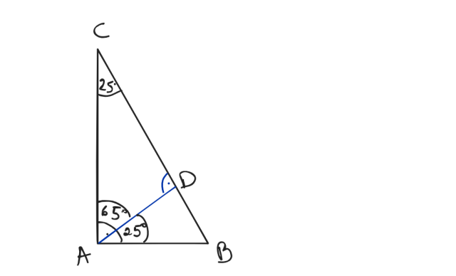 kąt BAD = 25, ponieważ 90° - 65° = 25°